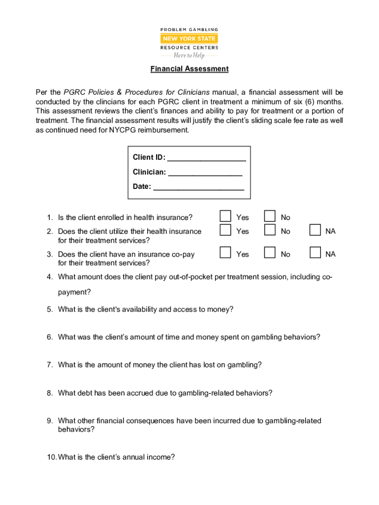 Financial Assessment Per the PGRC Policies & Procedures for Clinicians manual, a financial assessment will be conducted by the clincians for each PGRC client in treatment a minimum of six (6) months.