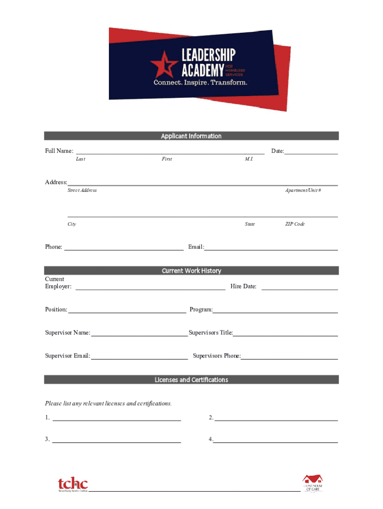 Applicant Information Full Name:Date: LastFirstM. I. Address: Street AddressApartment/Unit #CityStatePhone:Current Employer:Email:Current Work History Hire Date:Position:Program:Supervisor Name:Supervisors