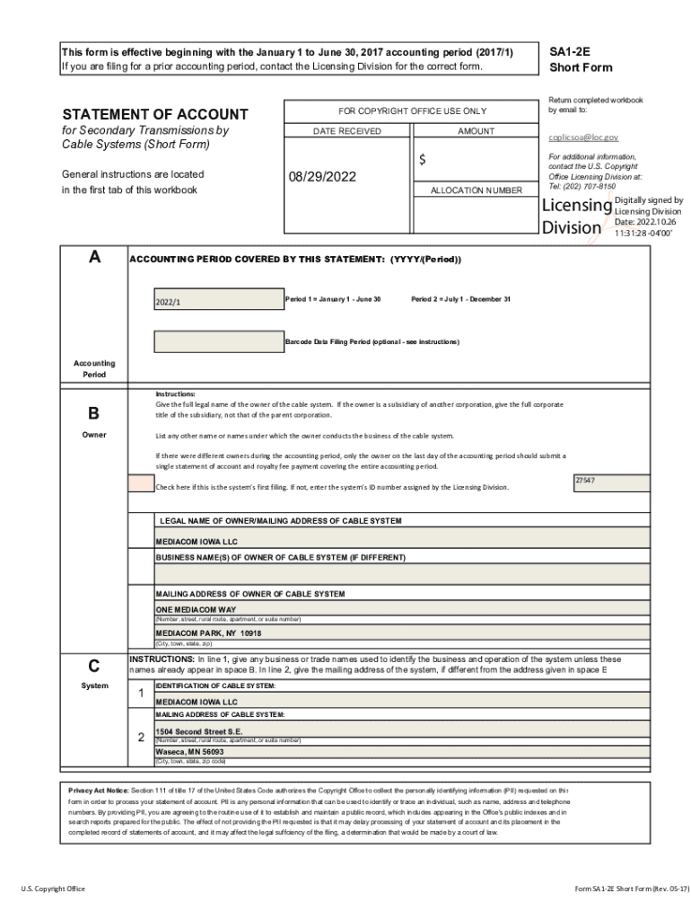 This document serves as the Statement of Account for Mediacom Iowa LLC for the accounting period January 1 to June 30, 2022, outlining gross receipts and royalty fees.