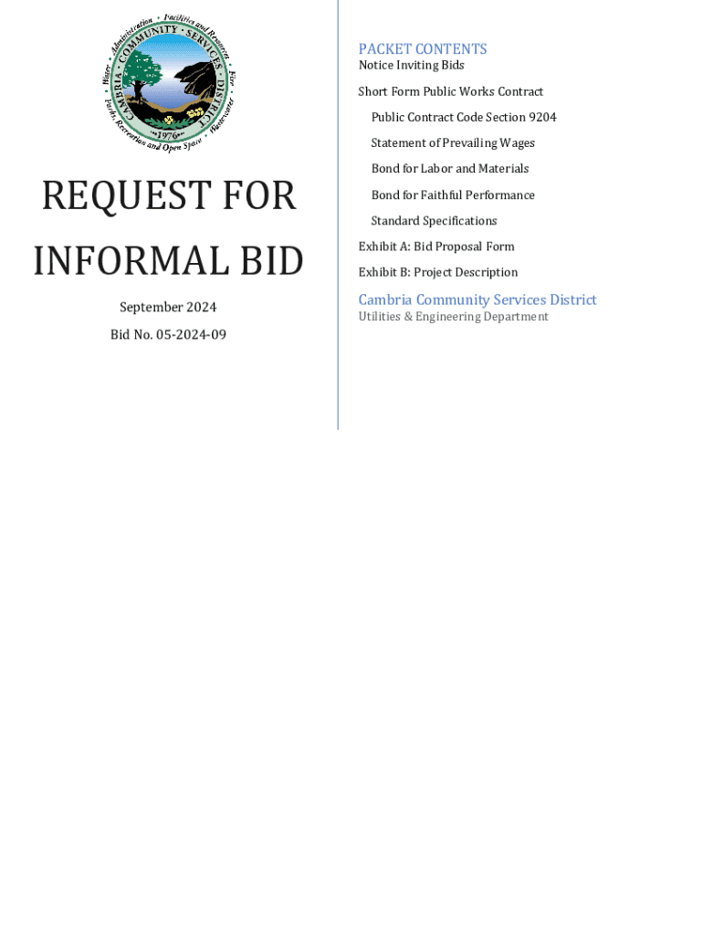 PACKET CONTENTS Notice Inviting Bids Short Form Public Works ContractPublic Contract Code Section 9204REQUEST INFORMAL BID September 2024Bid No. 05202409Statement of Prevailing Wages Bond for Labor