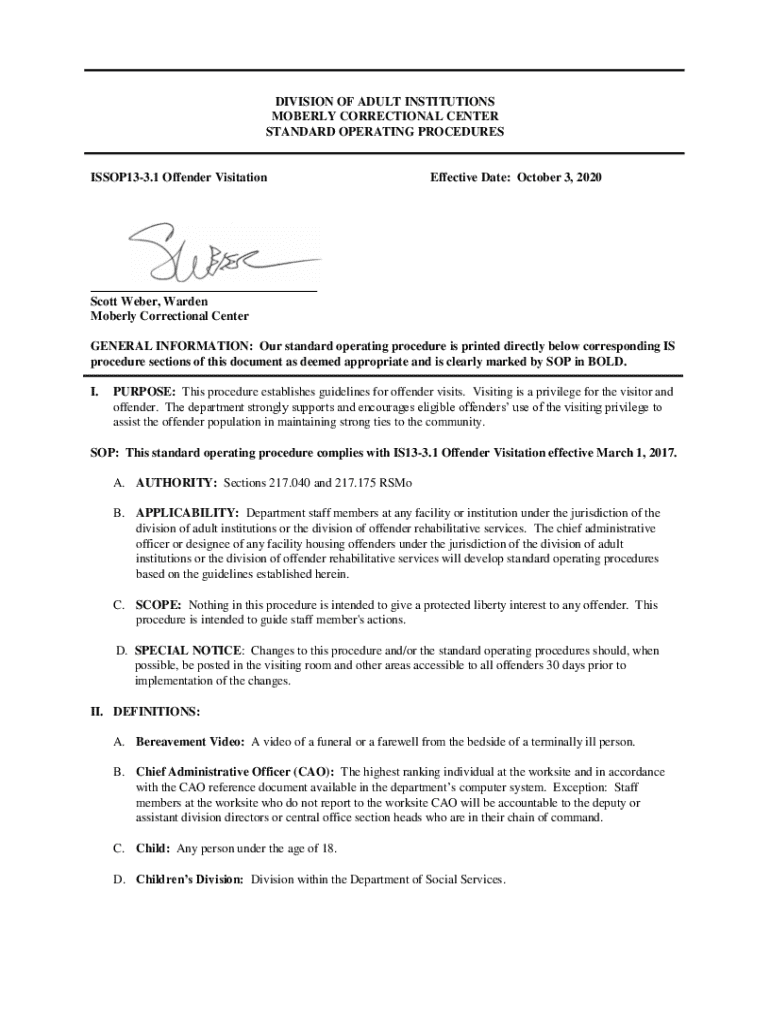 DIVISION OF ADULT INSTITUTIONS SOBERLY CORRECTIONAL CENTER STANDARD OPERATING PROCEDURESISSOP133.1 Offender VisitationEffective Date: October 3, 2020Scott Weber, Warden Soberly Correctional Center