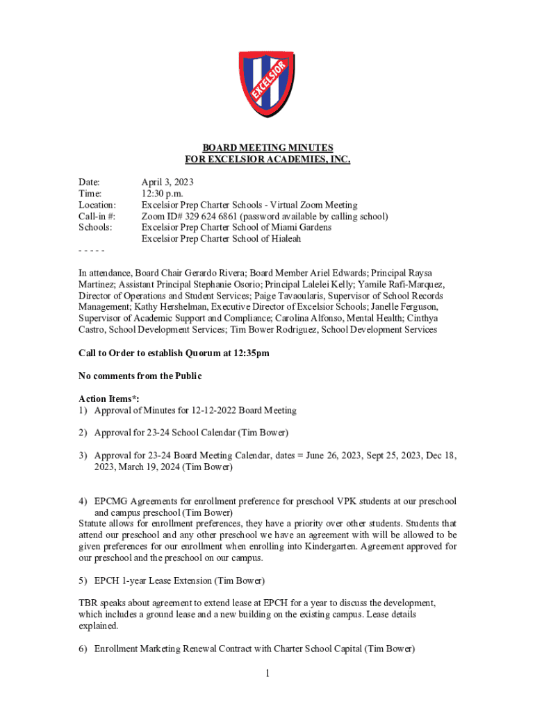 BOARD MEETING MINUTES FOR EXCELSIOR ACADEMIES, INC. Date: Time: Location: Calling #: Schools:April 3, 2023 12:30 p.m. Excelsior Prep Charter Schools Virtual Zoom Meeting Zoom ID# 329 624 6861 (password