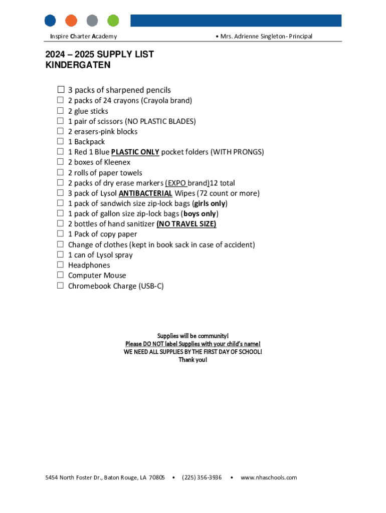 Inspire Charter Academy Mrs. Adrienne Singleton Principal2024 2025 SUPPLY LIST KINDERGATEN 3 packs of sharpened pencils 2 packs of 24 crayons (Crayola brand) 2 glue sticks 1 pair of scissors (NO PLASTIC