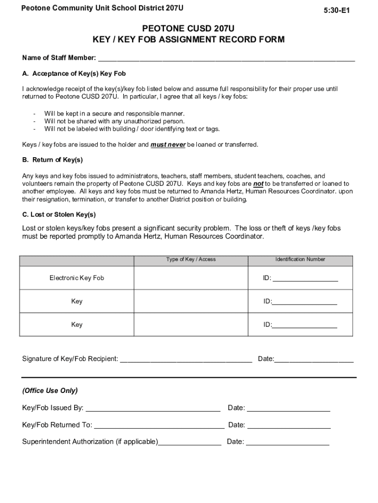 Document outlining the guidelines for the assignment and return of keys and key fobs at Peotone CUSD 207U, ensuring security and accountability.