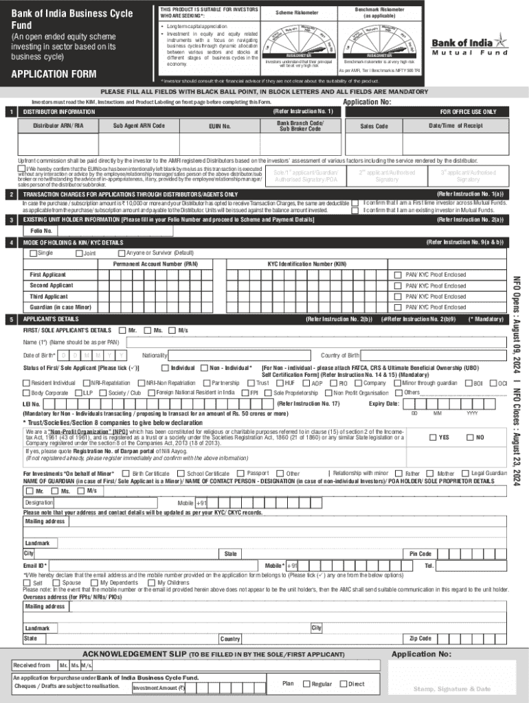 Apply for the Bank of India Business Cycle Fund in 2024. Focus on dynamic equity investment strategies across various business cycles to achieve long-term capital appreciation.