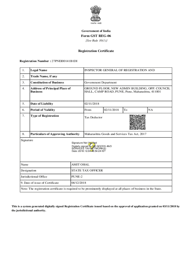 Government of Uniform GST REG06 [See Rule 10(1)]Registration Certificate Registration Number : 27PNEI00141B1DI 1. Legal NameINSPECTOR GENERAL OF REGISTRATION AND2. Trade Name, if any3. Constitution
