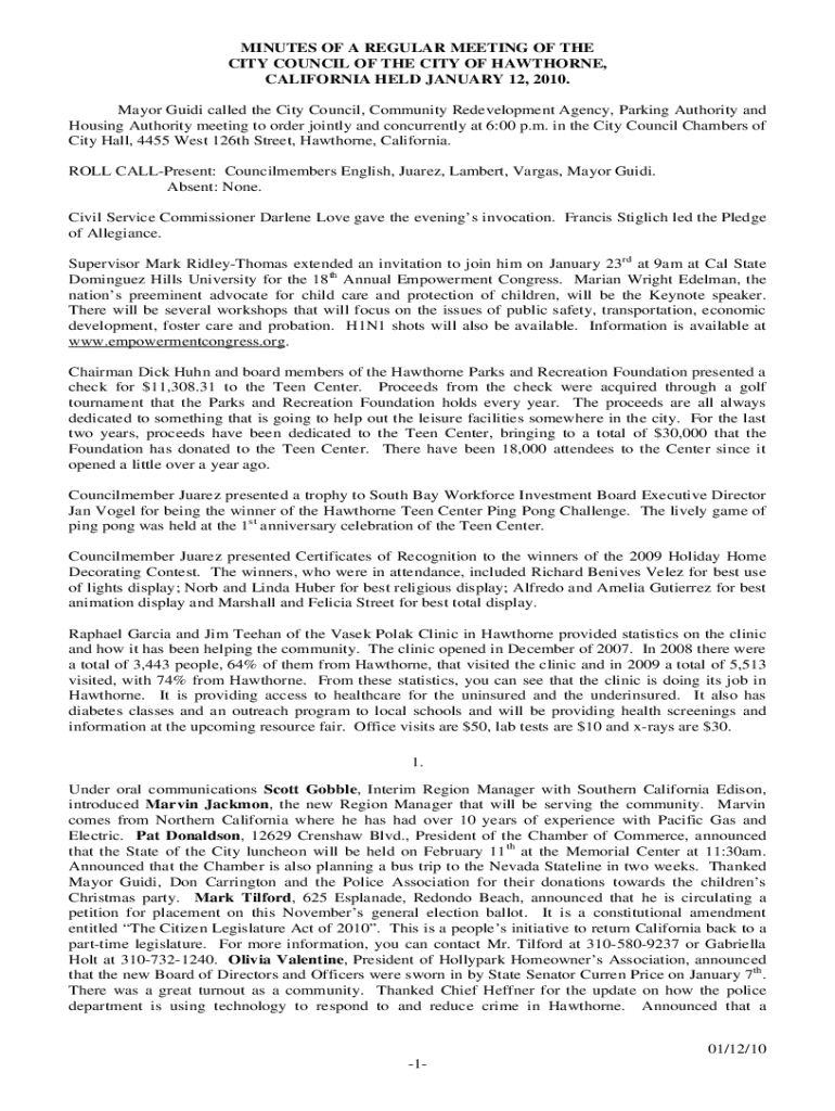 MINUTES OF A REGULAR MEETING OF THE CITY COUNCIL OF THE CITY OF HAWTHORNE, CALIFORNIA HELD JANUARY 12, 2010. Mayor Guidi called the City Council, Community Redevelopment Agency, Parking Authority