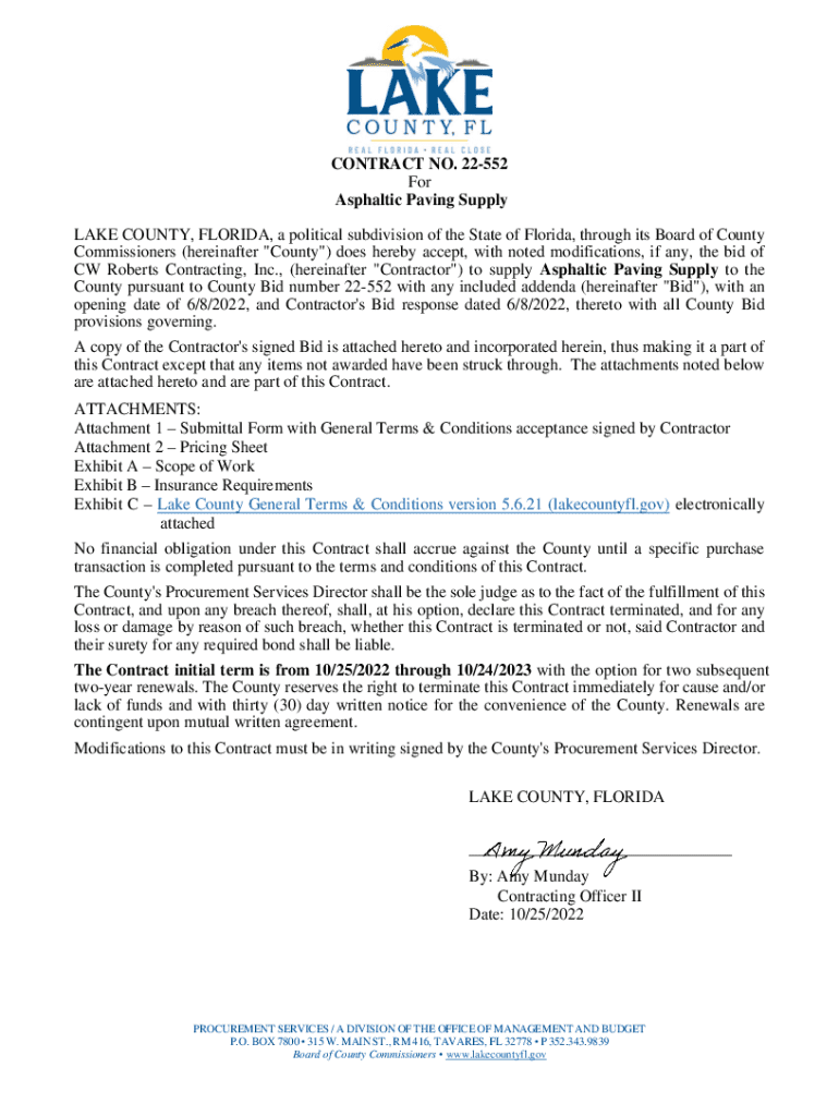 CONTRACT NO. 22552 For Asphalt Paving Supply LAKE COUNTY, FLORIDA, a political subdivision of the State of Florida, through its Board of County Commissioners (hereinafter \”County\”) does hereby