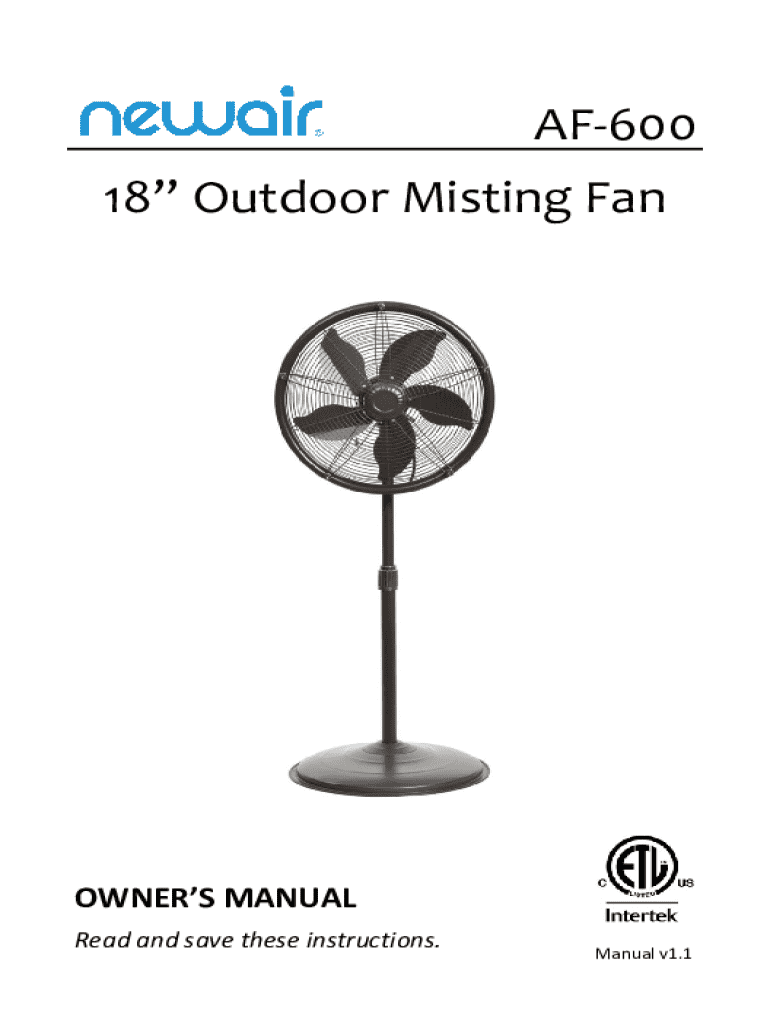 AF600 18 Outdoor Misting FanOWNERS MANUAL Read and save these instructions.Manual v1.12A Name You Can TrustTrust should be earned and we will earn yours. Customer happiness is the focus of our business.