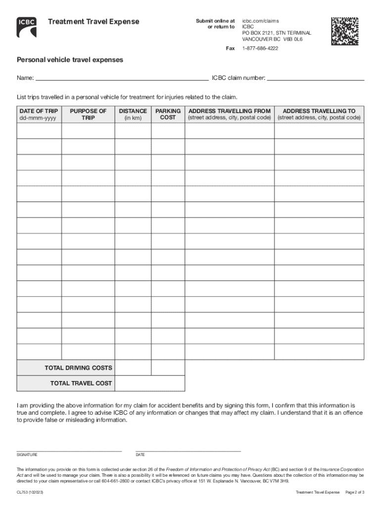 Download this PDF, then complete it using Acrobat Reader. Treatment Travel ExpenseSubmit online at or return toFaxicbc.com/claims ICBC PO BOX 2121, STN TERMINAL VANCOUVER BC V6B 0L6 18776864222Please