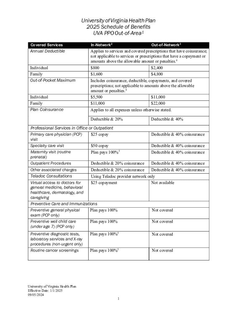 University of Virginia Health Plan 2025 Schedule of Benefits UVA PPO OutofArea1 Covered ServicesInNetwork2Annual DeductibleApplies to services and covered prescriptions that have coinsurance; not