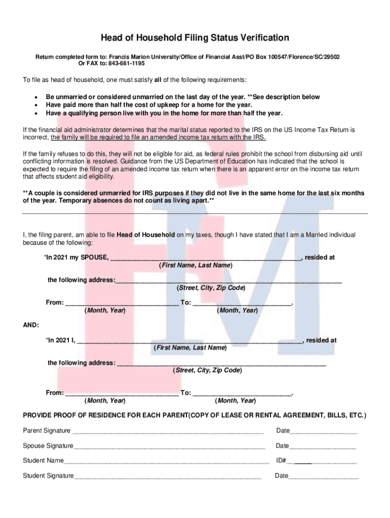 Head of Household Filing Status Verification Return completed form to: Francis Marion University/Office of Financial Asst/PO Box 100547/Florence/SC/29502 Or FAX to: 8436611195To file as head of household,