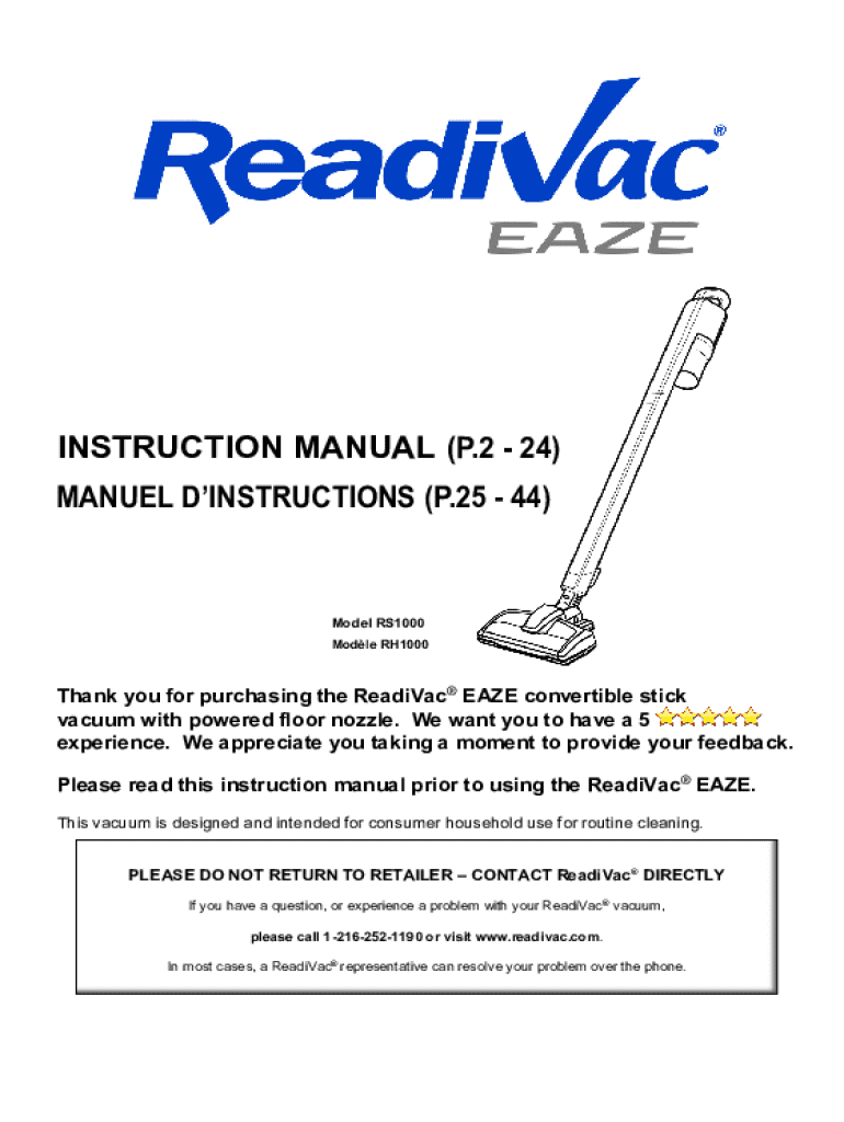 INSTRUCTION MANUAL (P.2 24) Manuel instructions (P.25 44)Model RS1000 Model RH1000Thank you for purchasing the Reading EASE convertible stick vacuum with powered floor nozzle. We want you to have