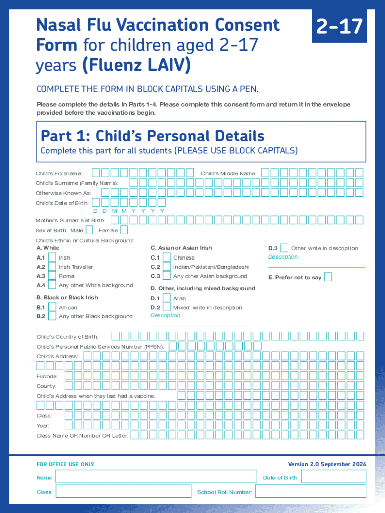 217Nasal Flu Vaccination Consent Form for children aged 217 years (Fluent LAID) COMPLETE THE FORM IN BLOCK CAPITALS USING A PEN. Please complete the details in Parts 14. Please complete this consent
