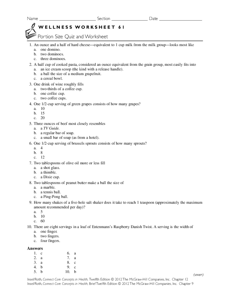Name ___ Section ___ Date ___ W E L L N E S S WO R K S H E E T 6 1Portion Size Quiz and Worksheet 1. An ounce and a half of hard cheeseequivalent to 1 cup milk from the milk grouplooks most like a.