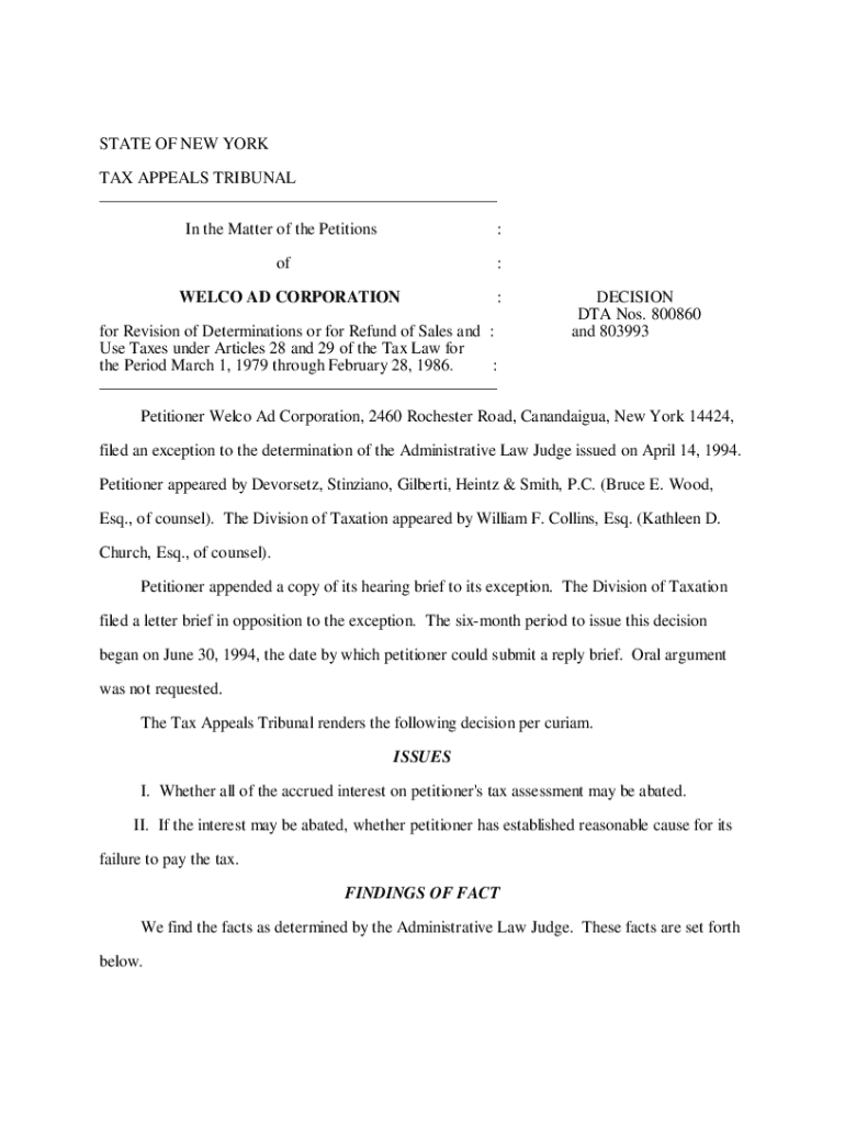 STATE OF NEW YORK TAX APPEALS TRIBUNAL ___ In the Matter of the Petitions:of:WELCO AD CORPORATION:for Revision of Determinations or for Refund of Sales and : Use Taxes under Articles 28 and 29 of
