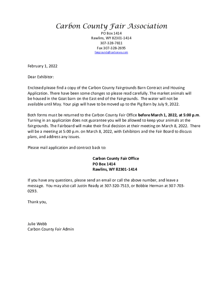 Carbon County Fair Association PO Box 1414 Rawlins, WY 823011414 3073287811 Fax 3073282695 fairgrounds@carbonwy.comFebruary 1, 2022 Dear Exhibitor: Enclosed please find a copy of the Carbon County