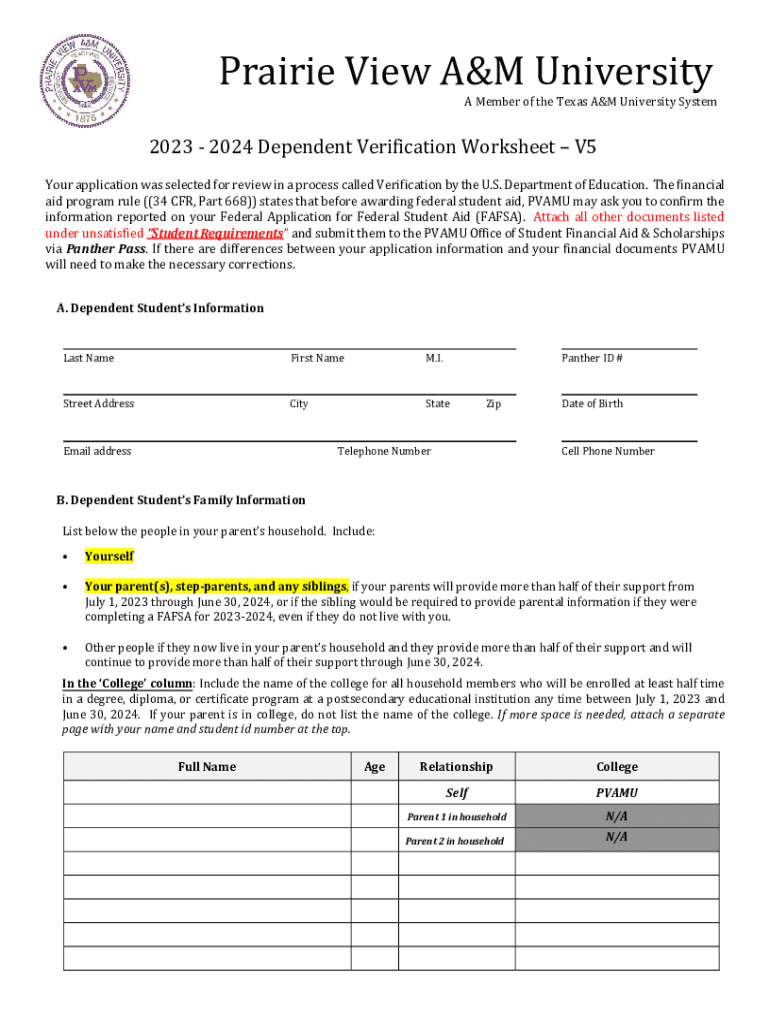 Prairie View A&M University Member of the Texas A&M University System2023 2024 Dependent Verification Worksheet V5Your application was selected for review in a process called Verification by the U.S.