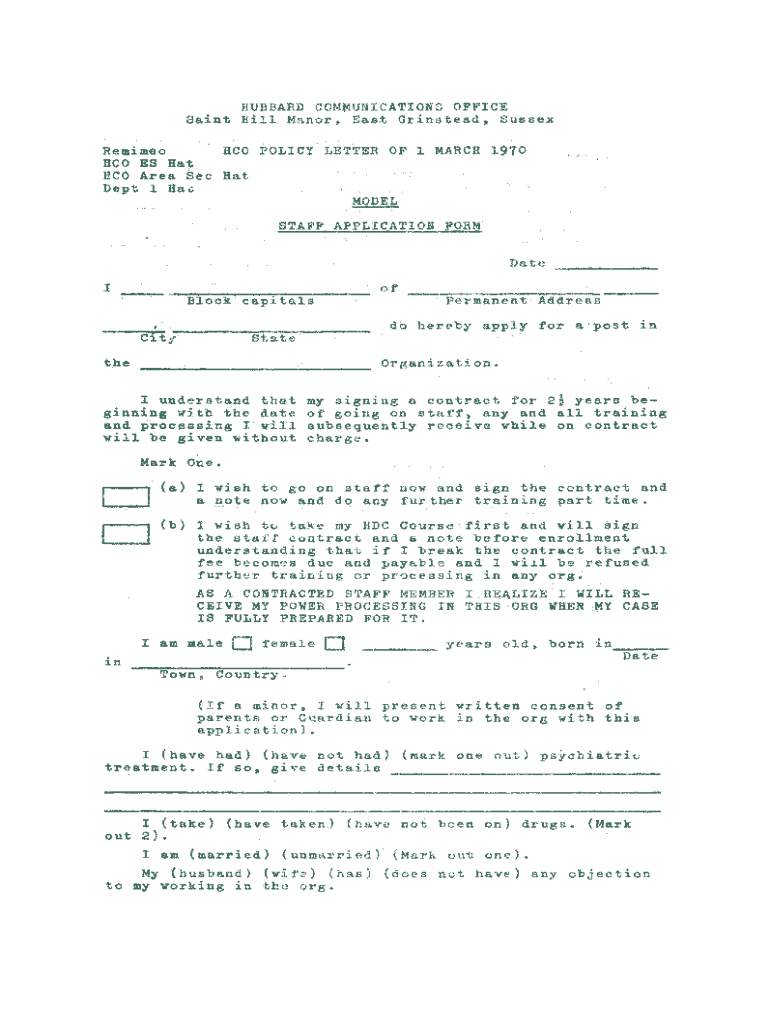 Apply for a position at Hubbard Communications Office with this detailed Staff Application Form. Ensure your qualifications and preferences are noted.