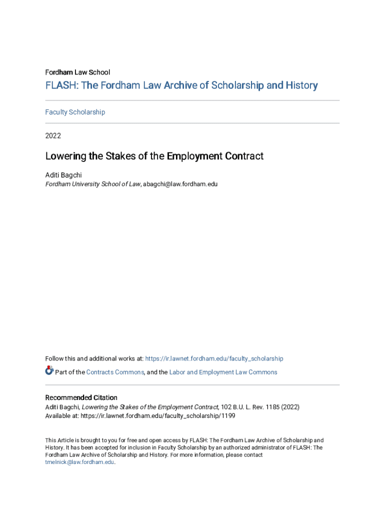 Fordham Law School FLASH: The Fordham Law Archive of Scholarship and History Faculty Scholarship 2022Lowering the Stakes of the Employment Contract Anti Bag chi Fordham University School of Law, abagchi@law.fordham.eduFollow