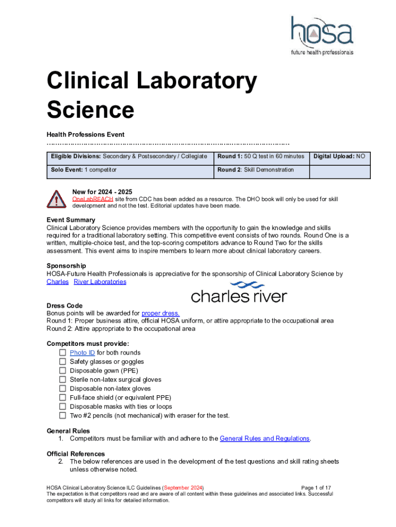 Clinical Laboratory Science Health Professions Event .. Eligible Divisions: Secondary & Postsecondary / CollegiateRound 1: 50 Q test in 60 minutesSolo Event: 1 competitorRound 2: Skill DemonstrationDigital