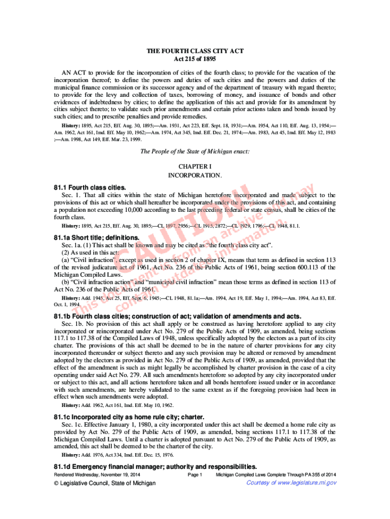 THE FOURTH CLASS CITY ACT Act 215 of 1895 AN ACT to provide for the incorporation of cities of the fourth class; to provide for the vacation of the incorporation thereof; to define the powers and