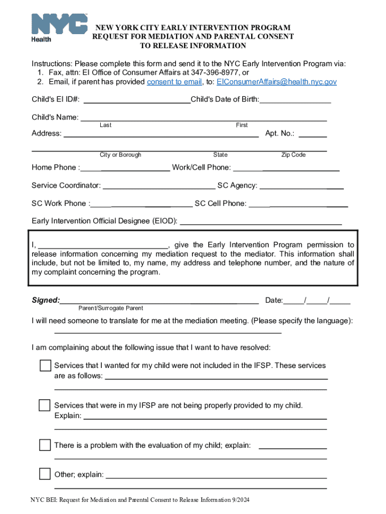 Complete the NYC Early Intervention Program mediation request form to consent to the release of information regarding your mediation issue. Ensure proper services for your child.