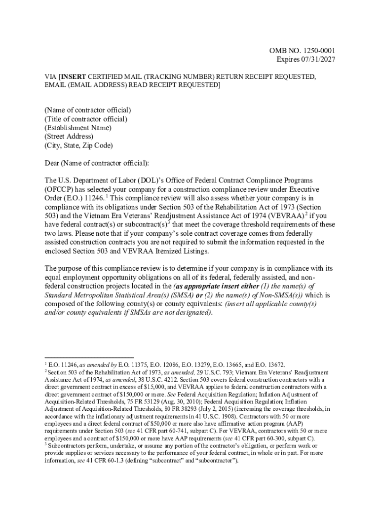 OMB NO. 12500001 Expires 07/31/2027 VIA [INSERT CERTIFIED MAIL (TRACKING NUMBER) RETURN RECEIPT REQUESTED, EMAIL (EMAIL ADDRESS) READ RECEIPT REQUESTED](Name of contractor official) (Title of contractor