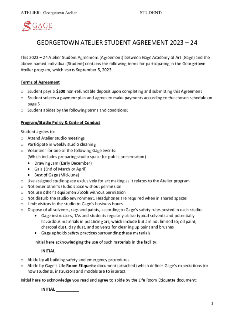 ATELIER: Georgetown AtelierSTUDENT:GEORGETOWN ATELIER STUDENT AGREEMENT 2023 24 This 2023 24 Atelier Student Agreement (Agreement) between Gage Academy of Art (Gage) and the above named individual