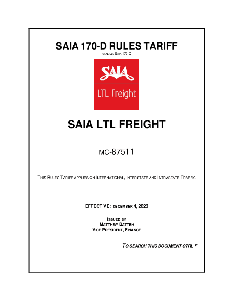 SAID 170D RULES TARIFF CANCELS SAID 170CSAIA LTL FREIGHT MC87511THIS RULES TARIFF APPLIES ON INTERNATIONAL, INTERSTATE AND INTRASTATE TRAFFICEFFECTIVE:DECEMBER 4, 2023ISSUED BY MATTHEW BATTED VICE
