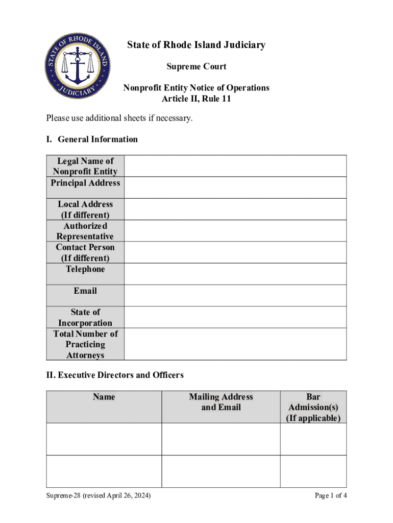 State of Rhode Island Judiciary Supreme Court Nonprofit Entity Notice of Operations Article II, Rule 11 Please use additional sheets if necessary. I. General Information Legal Name of Nonprofit Entity
