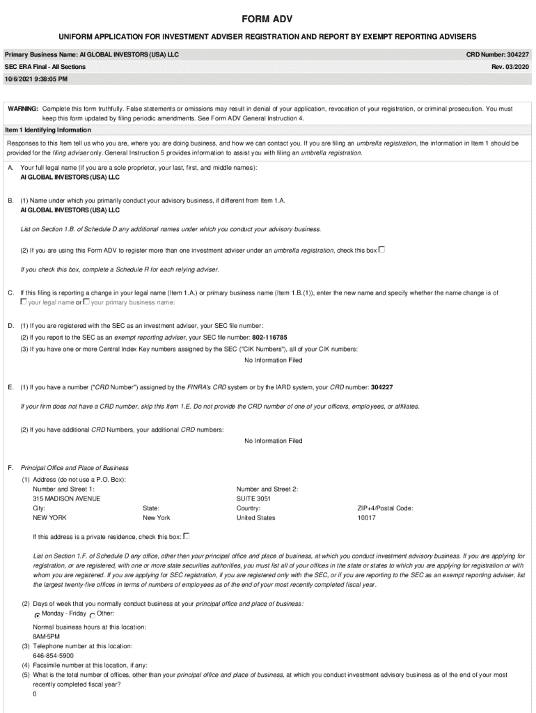 This document details the registration of AI GLOBAL INVESTORS (USA) LLC as an investment adviser, including compliance, address, and operational information.