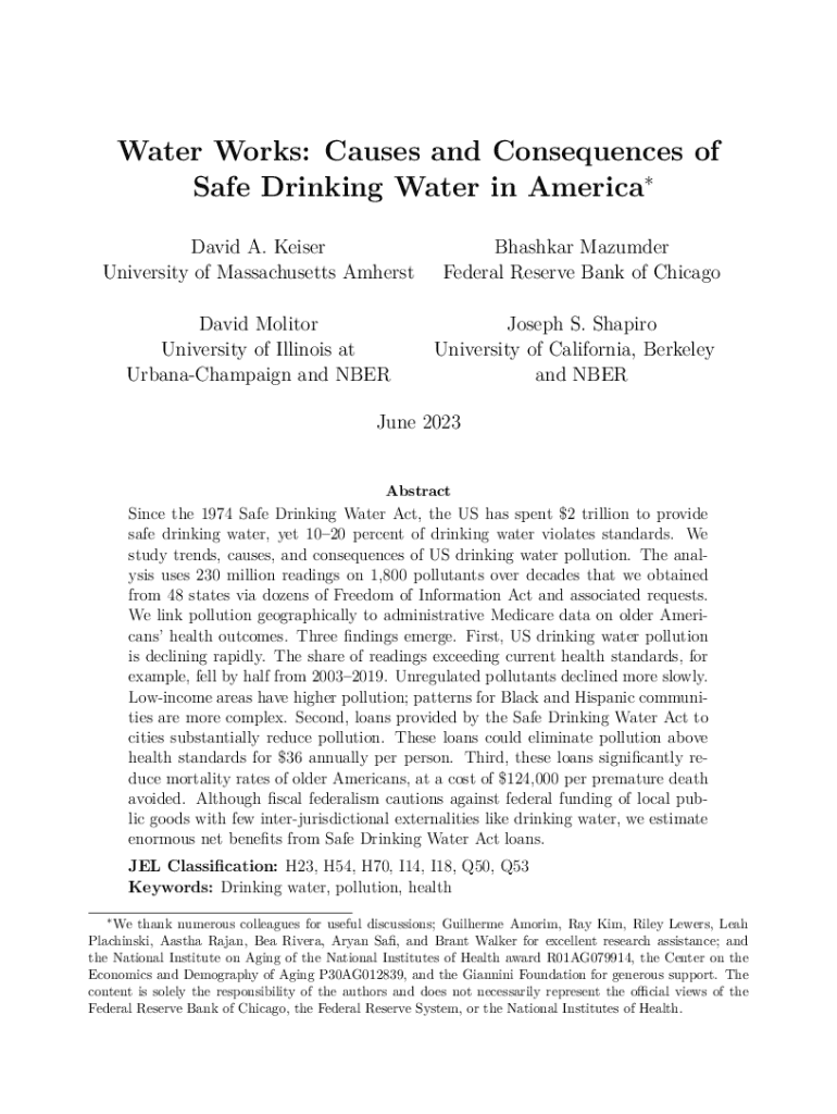 Water Works: Causes and Consequences of Safe Drinking Water in America David A. Keiser University of Massachusetts Amherst David Molitor University of Illinois at UrbanaChampaign and NBERBhashkar