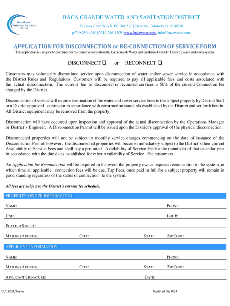 BACA GRANDE WATER AND SANITATION DISTRICT 57 Baca Grant Way S PO Box 520 | Crestone, Colorado 811310520 p:7192564310 | f:7192564309 | www.bacawater.com | info@bacawater.comAPPLICATION FOR DISCONNECTION