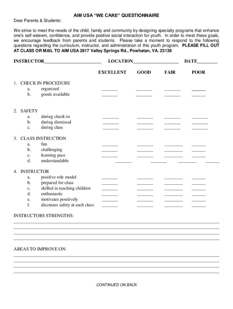 AIM USA WE CARE QUESTIONNAIRE Dear Parents & Students: We strive to meet the needs of the child, family and community by designing specialty programs that enhance one\'s self esteem, confidence, and