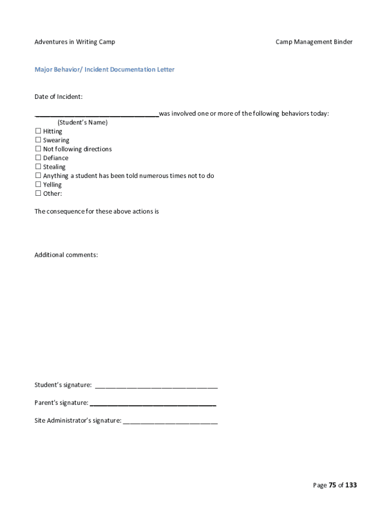 Adventures in Writing Bandcamp Management Binder Major Behavior/ Incident Documentation Littermate of Incident: ___was involved one or more of the following behaviors today: (Students Name) Hitting