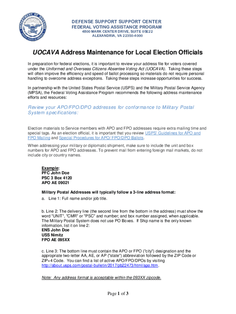 DEFENSE SUPPORT SUPPORT CENTERFEDERAL VOTING ASSISTANCE PROGRAM 4800 MARK CENTER DRIVE, SUITE 05E22 ALEXANDRIA, VA 223504000UOCAVA Address Maintenance for Local Election Officials In preparation for