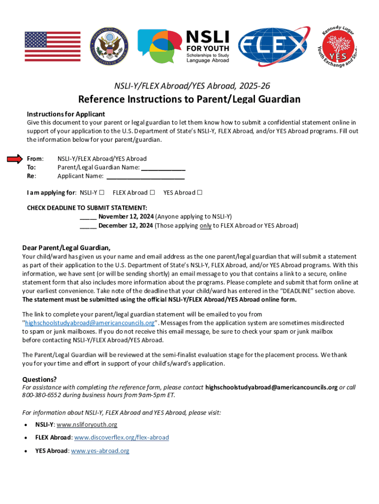 Essential instructions for parents/guardians on submitting confidential statements online for the NSLI-Y, FLEX Abroad, or YES Abroad application process for 2025-26.