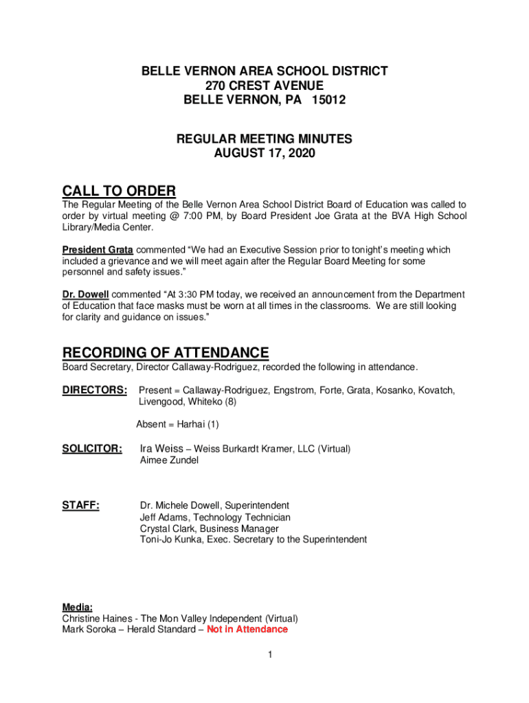 Detailed minutes from the Belle Vernon Area School District\'s regular meeting held on August 17, 2020, covering attendance, approvals, communications, and personnel updates.