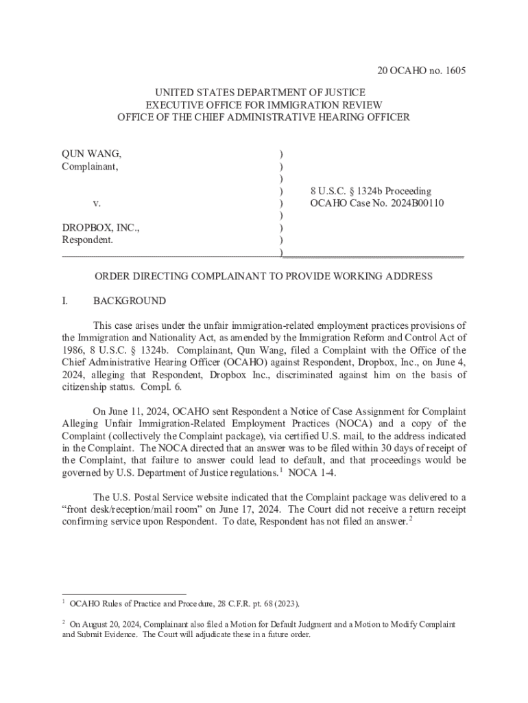 20 OCAHO no. 1605 UNITED STATES DEPARTMENT OF JUSTICE EXECUTIVE OFFICE FOR IMMIGRATION REVIEW OFFICE OF THE CHIEF ADMINISTRATIVE HEARING OFFICER QUN WANG, Complainant, v. DROPBOX, INC., Respondent.)