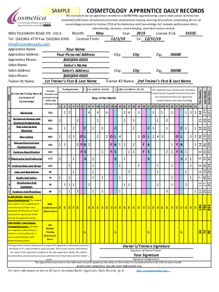 COSMETOLOGY APPRENTICE DAILY RECORDSSAMPLEThe curriculum for an apprentice enrolled in a BARBERING apprenticeship course shall consist of thirtytwo hundred(3,200) hours of technical instruction and