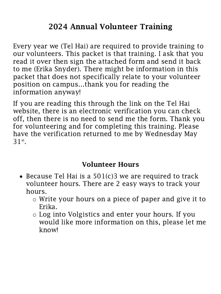 2024 Annual Volunteer Training Every year we (Tel Hai) are required to provide training to our volunteers. This packet is that training. I ask that you read it over then sign the attached form and