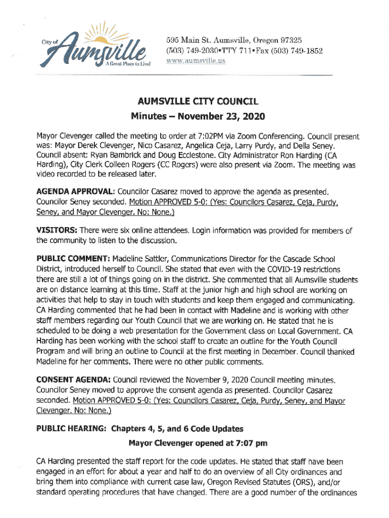MinutesCITYCOUNCILNovember23,2020Mayor Cleverer called the meeting to order at 7:02PM via Zoom Conferencing,