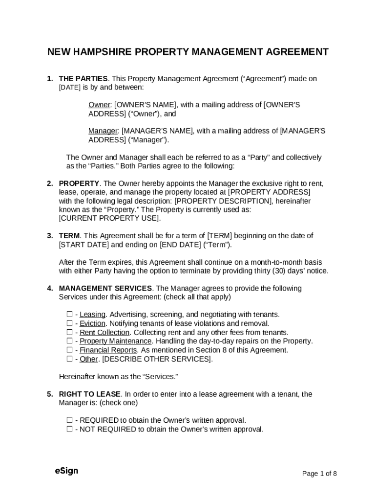 The New Hampshire Property Management Agreement is a Word document that has to be completed and signed for specific purpose. Next, it is provided to the actual addressee in order to provide certain information of certain kinds. The completion and signing is able or with a suitable solution like PDFfiller. These services help to send in any PDF or Word file without printing out. It also lets you customize its appearance for the needs you have and put a legal e-signature. Once finished, you send the New Hampshire Property Management Agreement to the recipient or several recipients by mail and even fax. PDFfiller has got a feature and options that make your Word form printable. It has various settings for printing out appearance. It does no matter how you will file a document - physically or by email - it will always look professional and organized. In order not to create a new document from the beginning again and again, turn the original document into a template. After that, you will have a customizable sample.