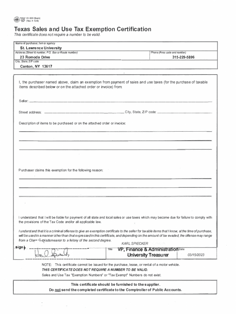 Obtain the Texas Sales and Use Tax Exemption Certification (Form 01-339) from the Texas Comptroller's website.