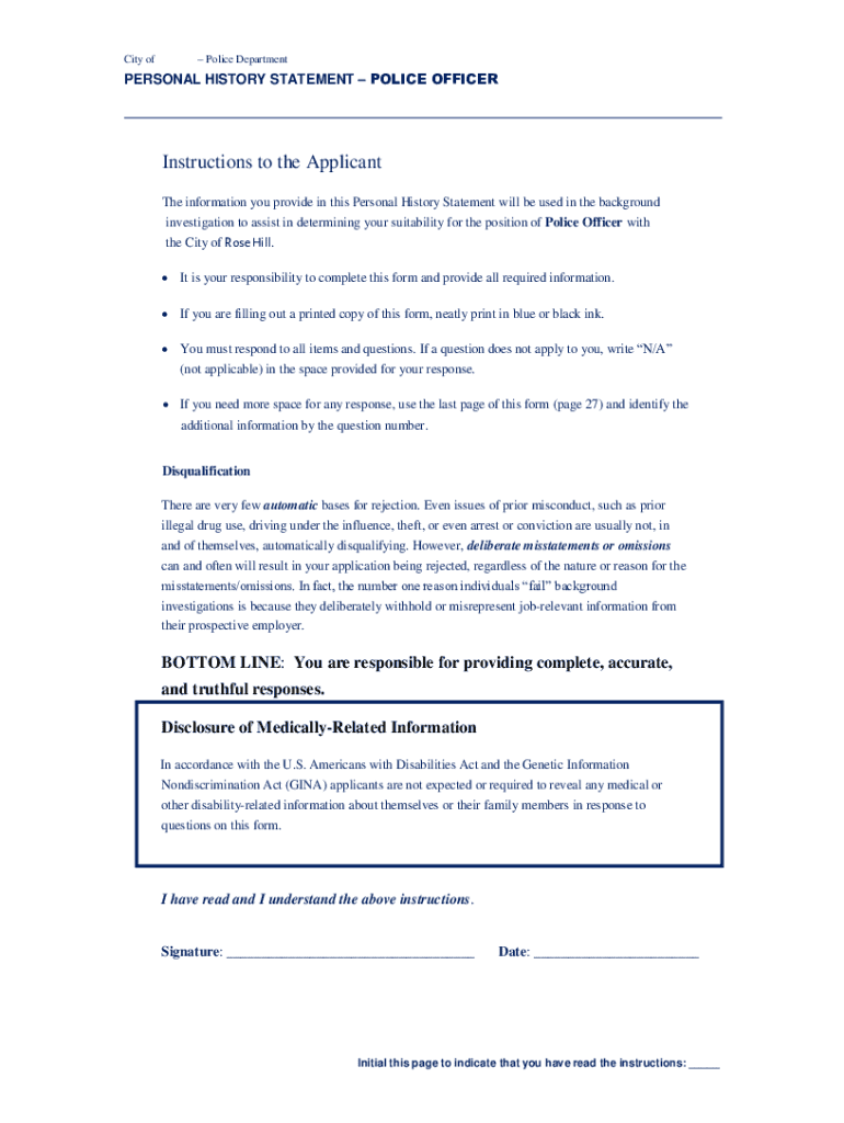To fill out a personal history statement for police, carefully read the instructions, provide accurate and complete information regarding your background, and ensure all sections are filled out, including personal data, employment history, and any legal issues.