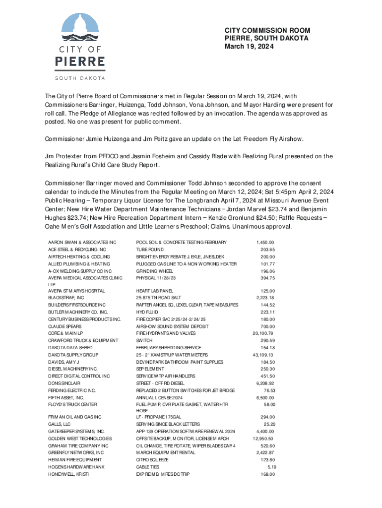 CITY COMMISSION ROOM PIERRE, SOUTH DAKOTA March 19, 2024The City of Pierre Board of Commissioners met in Regular Session on March 19, 2024, with Commissioners Bar ringer, Huizen, Todd Johnson, Mona