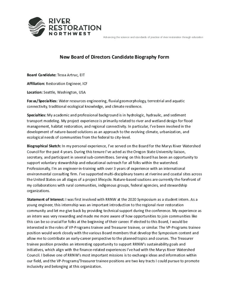 Advancing the science and standards of practice of river restoration through education Board of Directors Candidate Biography Form Board Candidate: Tessa Arthur, EIT Affiliation: Restoration Engineer,