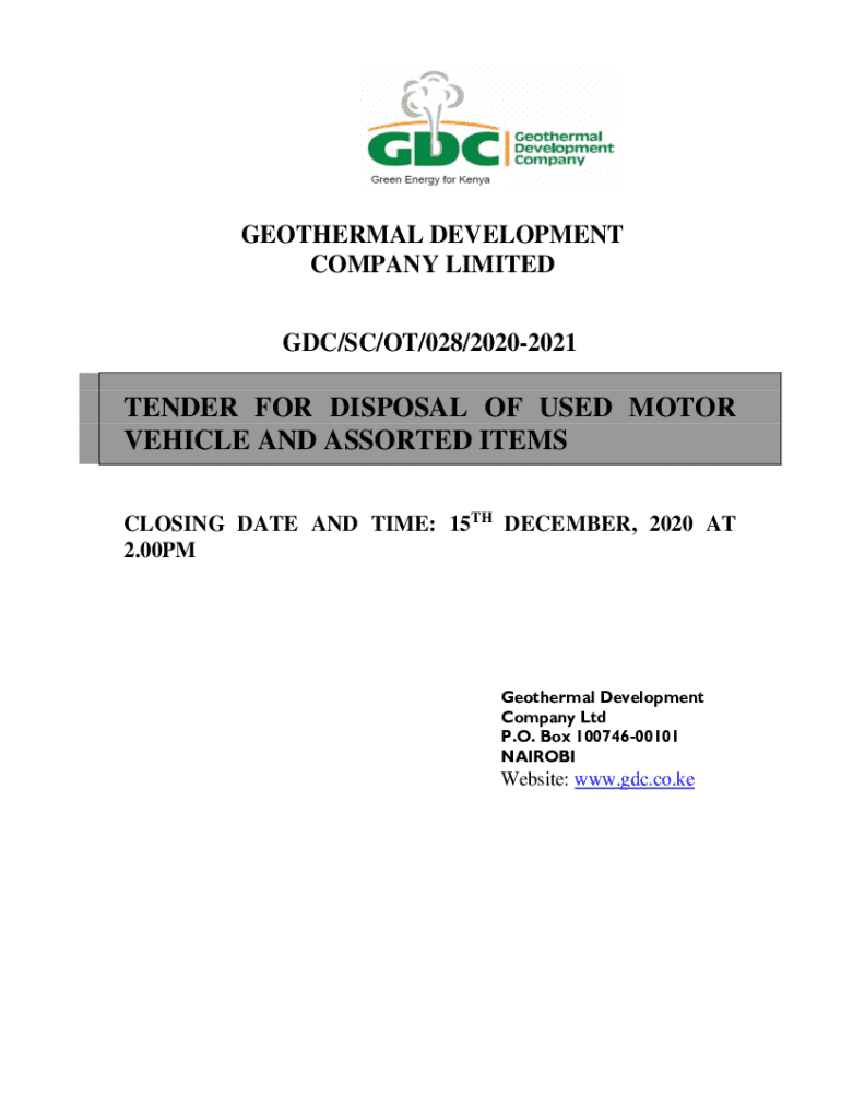 Geothermal Development Company invites tenders for the disposal of used vehicles and assorted items. Submit bids by December 15, 2020, at 2:00 PM.
