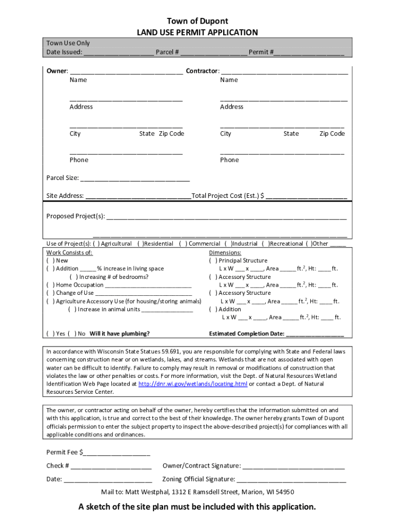 Town of Dupont LAND USE PERMIT APPLICATION Town Use Only Date Issued: ___ Parcel # ___ Permit #___ Owner: ___ Contractor: ___ Name ___ Address___ Address___ City State Zip Code___ City State Zip Code___